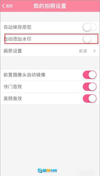 5、将设置栏中显示的自动添加水印按钮关掉后,拍出的照片上就没有水印了。