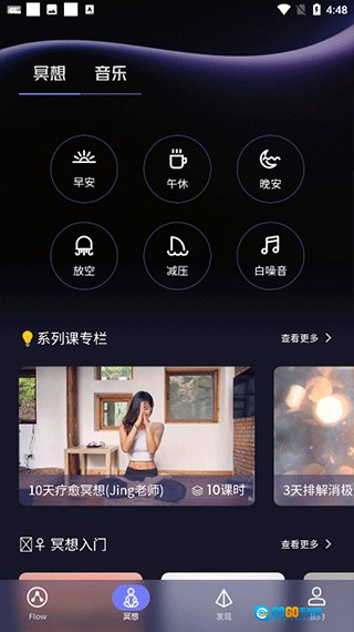 2、冥想界面有冥想和音乐两大板块,冥想板块可根据时间早中晚和状态放空、解压来选择,音乐板块有各种白噪音、古典音乐、爵士等。