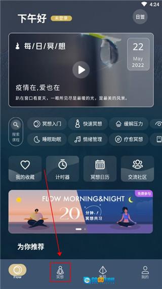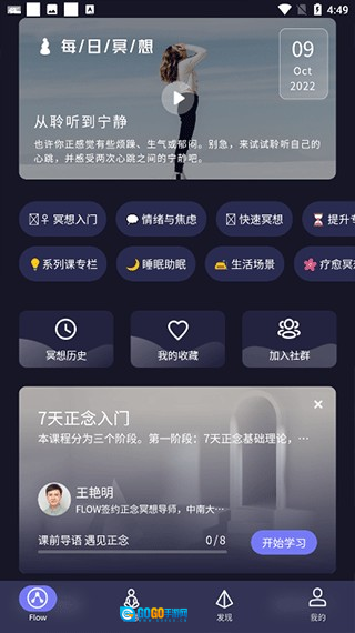 1、FLOW冥想界面可以每日打卡,提供冥想入门、快速冥想、提升专注、关系处理、诗歌冥想等功能,页面下滑还有各种推荐活动,精选课程。