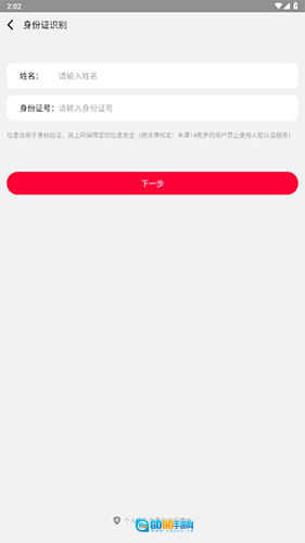 2、输入姓名以及身份证号码,然后点击“下一步”选项。