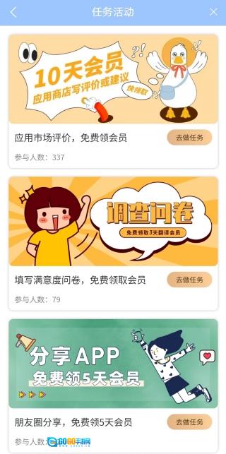 5、首次安装这款应用的用户会拥有30次的免费翻译机会,大家可以体验试用这款应用之后再斟酌这款应用适不适合您,需不需要开通付费服务,最低9.9元/元即可享受无限次泰语文本翻译,除此之外,还能够在主页下方的活动专区白嫖到3~10天的免费会员功能实用,只需要分享App或填写问卷等即可。