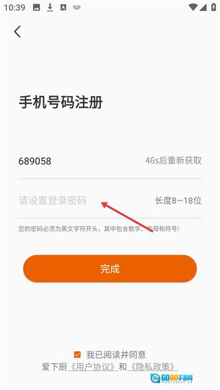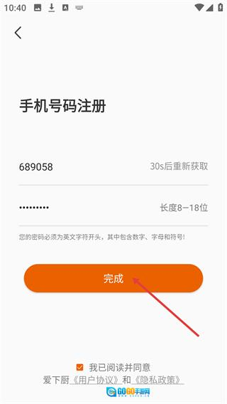 4、填写好验证码以及符合要求的登录密码后,点击【完成】按钮,即可完成爱下厨的手机号码注册流程。