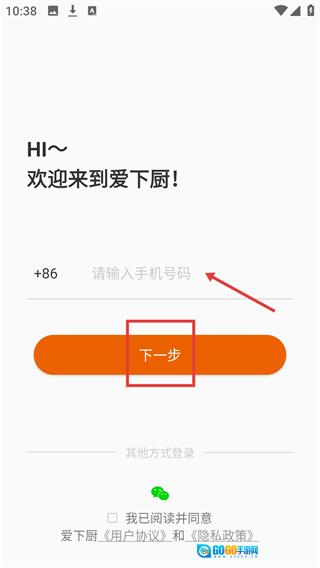 1、进入爱下厨的欢迎页面后,在【请输入手机号码】栏填写号码,勾选【用户协议】与【隐私政策】,接着点击【下一步】即可进入注册流程。