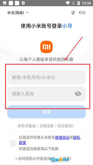 3、请在输入框中按顺序填写【邮箱/手机号码/小米ID】以及与之对应的密码。