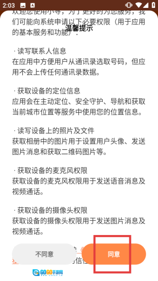 1、启动应用后,会弹出权限请求窗口,点击【同意】按钮,授予应用所需的必要权限,这样才能确保各项功能都能正常运行。