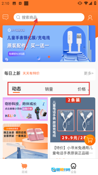 3、进入【商城】页面后,你可以通过顶部的【搜索商品】栏输入关键词来查找商品,还能借助【动态】【销量】【价格】等标签对商品进行排序,从而快速筛选出自己喜欢的商品。