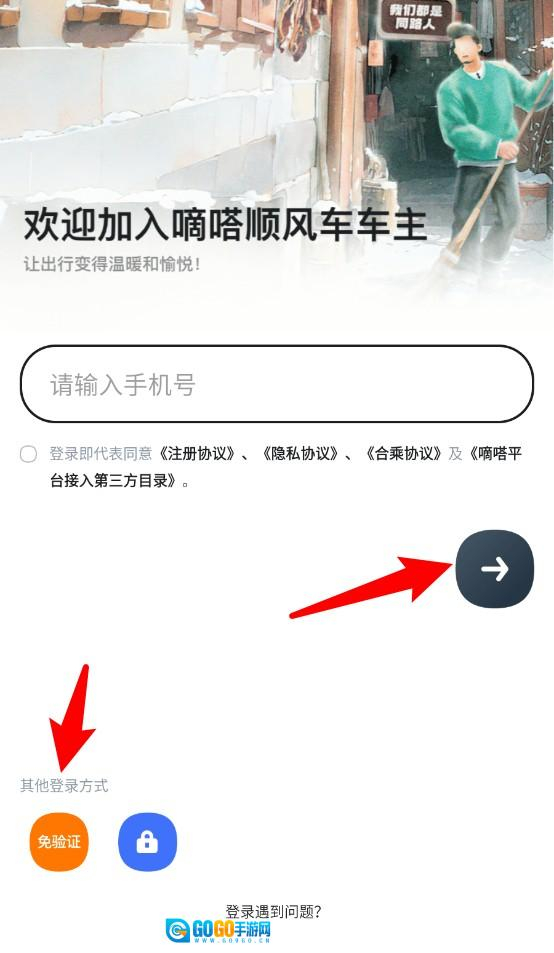 1、打开页面后,输入手机号并勾选相关协议,接着点击箭头按钮,就能快速完成嘀嗒顺风车车主的注册流程。