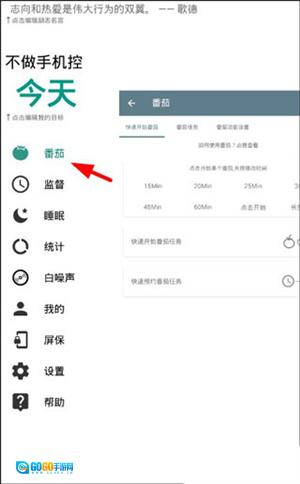 1、打开不玩手机应用,点击左上角的横杠按钮展开菜单列表,选择“番茄”选项,就能设置番茄任务提醒。