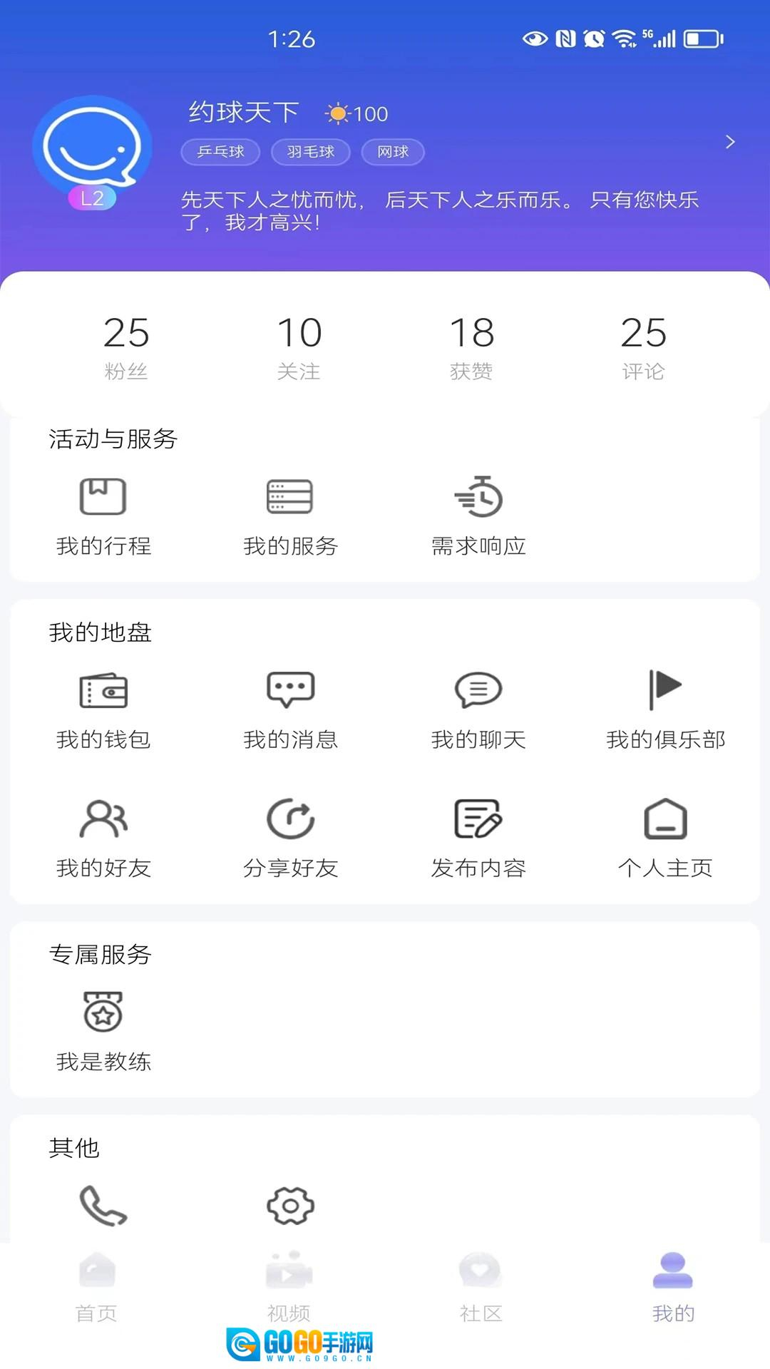 5、每位球友都拥有专属主页,页面包含信用积分、消费记录、钱包、我的活动、我的预约、我的服务、我的朋友、我的群组等功能模块,往下滑动还能看到兴趣爱好与个人设置板块。球友们可依据自身偏好对主页进行个性化设计。