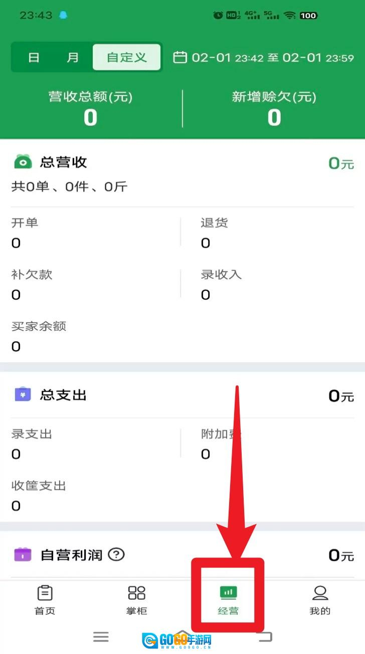 3. 进入经营页面后,能够查看营收、支出、利润等经营相关数据,并且可以按照日或月进行自定义筛选。