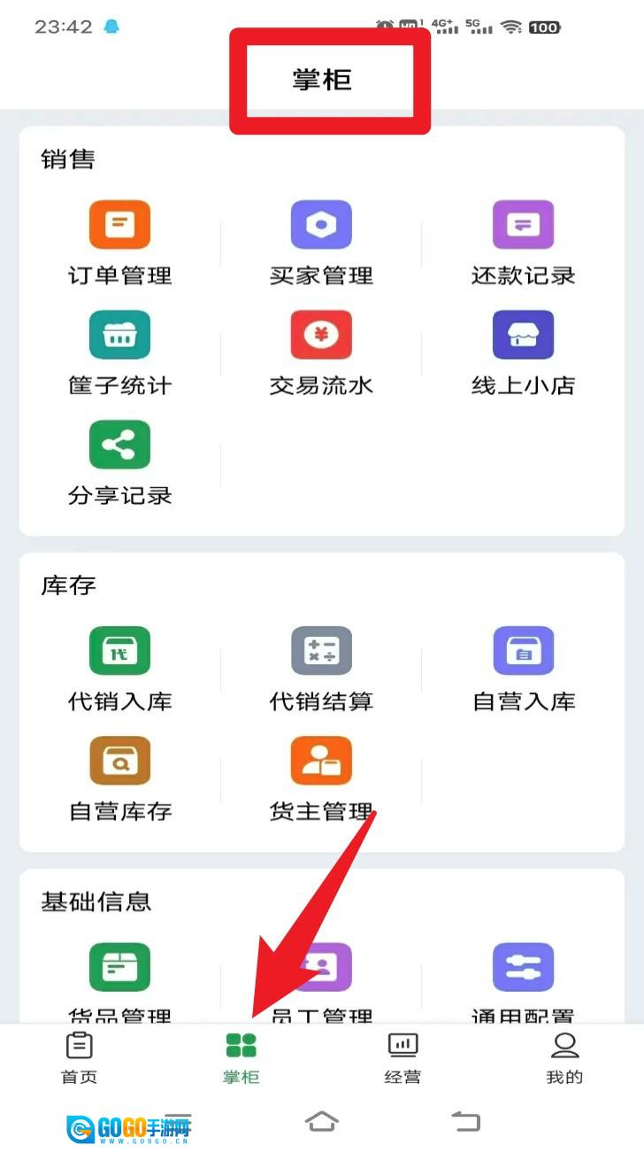 2. 进入首页后点击底部的掌柜页签,就能使用订单管理、买家管理、库存管理等核心功能了。