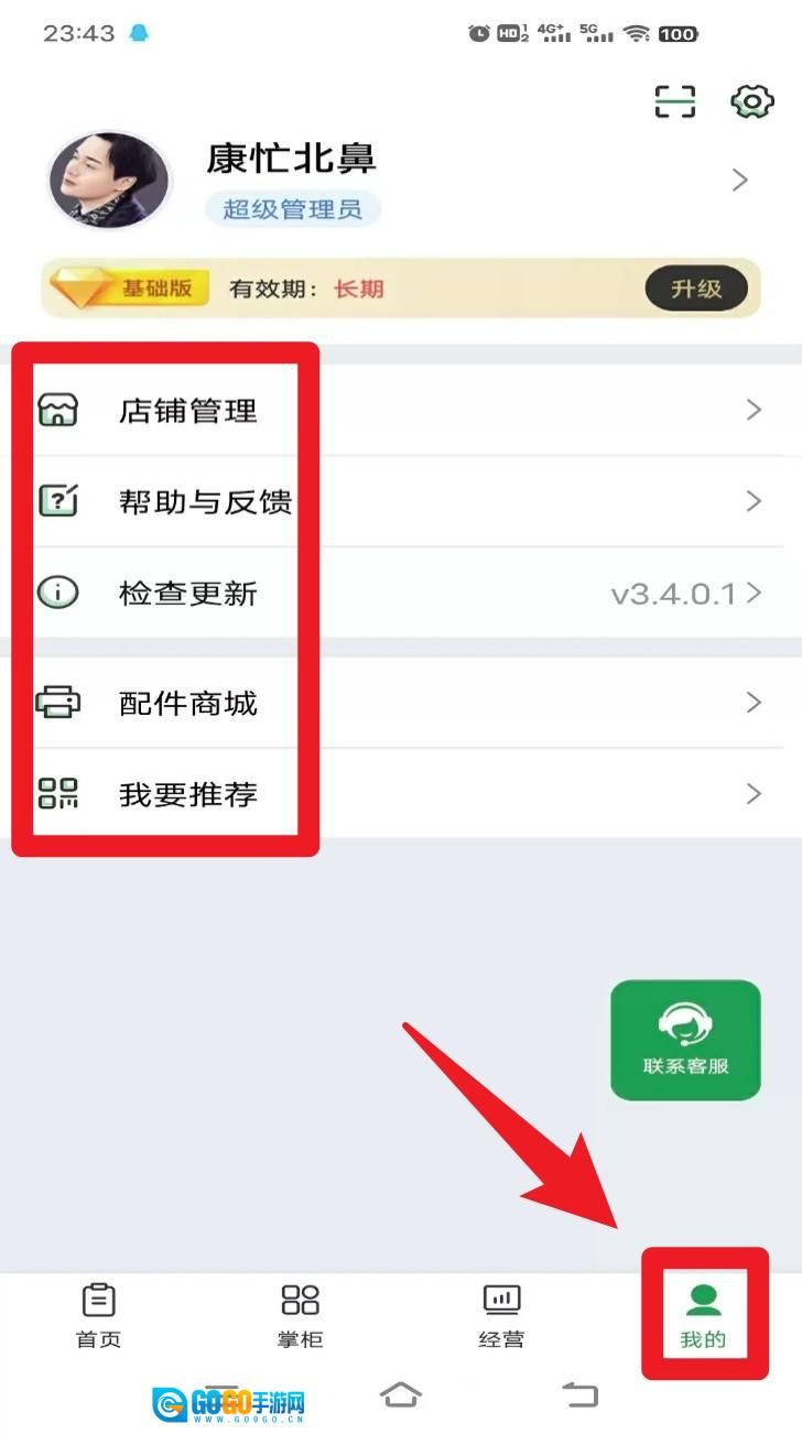 4. 点击右下角的“我的”页面,可进入店铺管理界面、检查应用更新或联系客服,同时支持将应用推荐分享给他人。