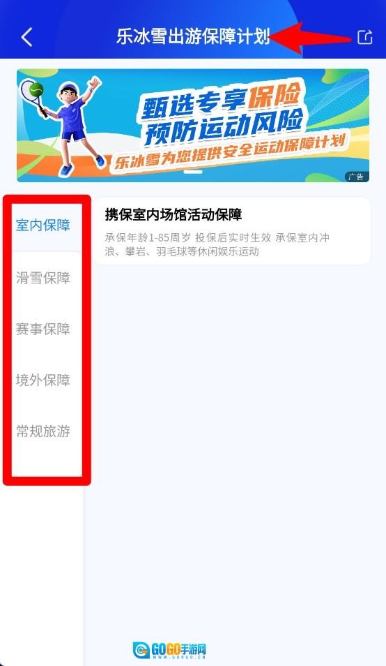 4、保障服务页面提供室内滑雪、赛事、境外及常规旅游保障等选项,分类清晰明确,适用范围十分广泛。