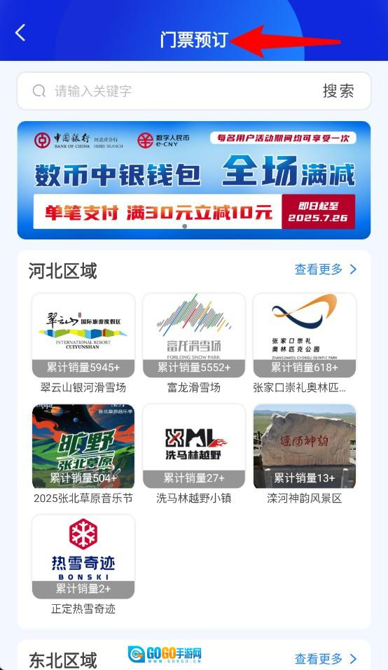 2、点击门票预订后,可查看各地滑雪场及景区的门票信息,系统支持搜索功能与按区域分类浏览的方式。