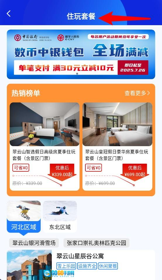 3、住玩套餐页面推出热门酒店与景区联票的组合产品,价格标注清晰明确,十分适合有短途度假计划的用户选择。