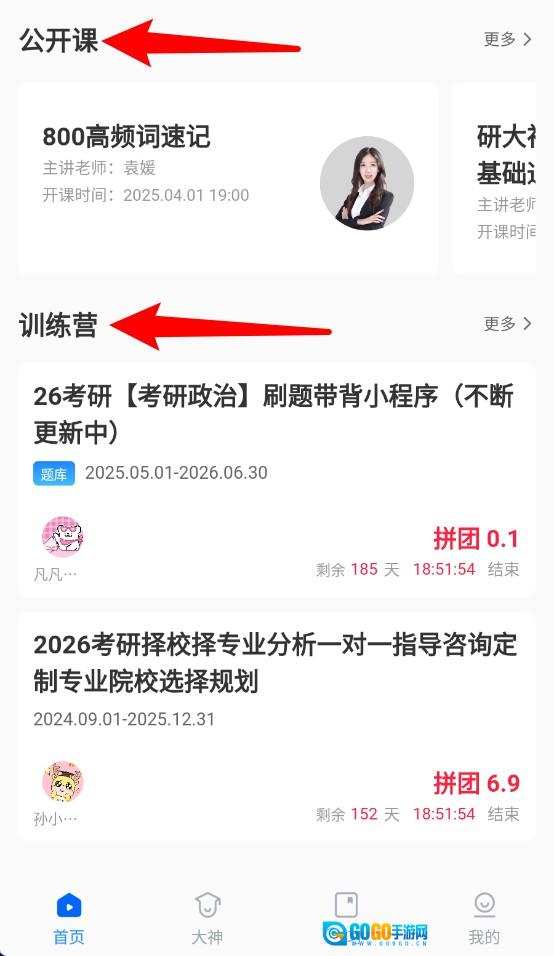 3、页面中部设有公开课与训练营板块,可查看课程时间、主讲老师及团购信息等内容。