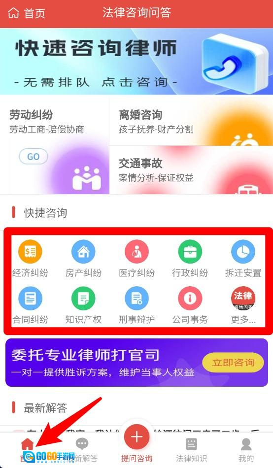 1、首页设有快速咨询律师的功能,覆盖劳动纠纷、离婚咨询等多种法律问题类型,点击后可进入详细分类页面。