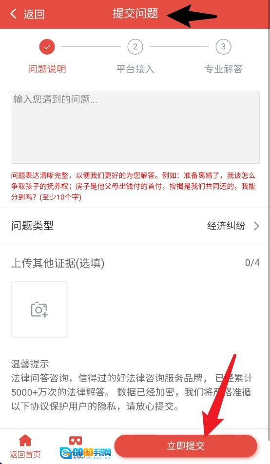 3、提交问题的界面引导清晰明了,用户能够填写问题说明并上传相关佐证资料,在选择好纠纷类型后点击立即提交,即可获取专业的解答。
