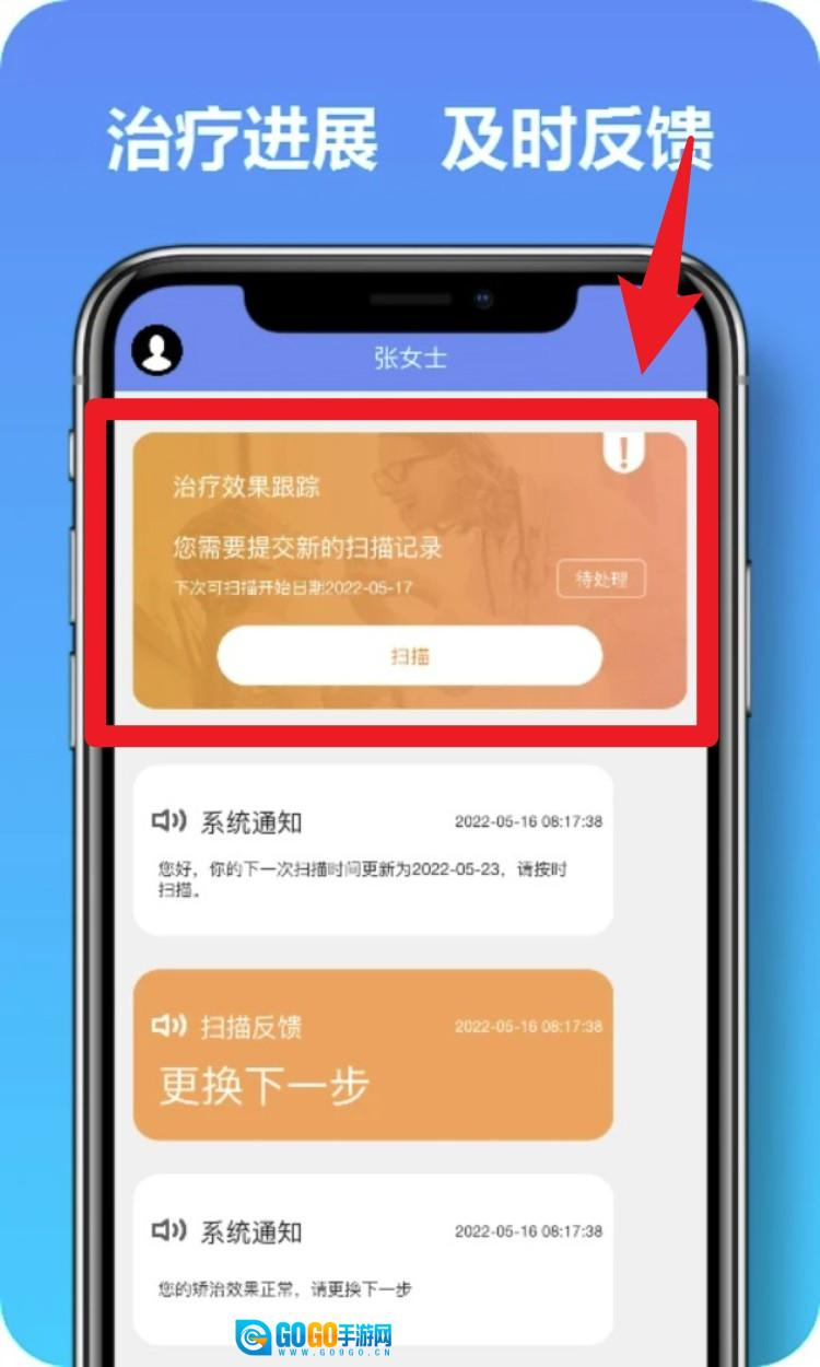 2. 登录后,在首页就能查看治疗效果跟踪情况,点击扫描按钮即可上传新的牙齿记录。