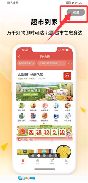 应用启动后,点击跳过按钮即可直接进入在线商城的主页面。