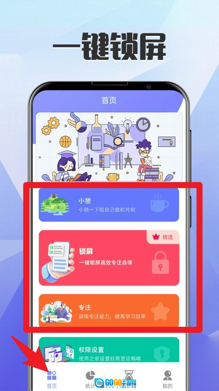 1. 打开应用后,点击底部导航栏的首页,就能快速进入包含一键锁屏、小憩、专注等功能的区域,开启自律模式的管理。