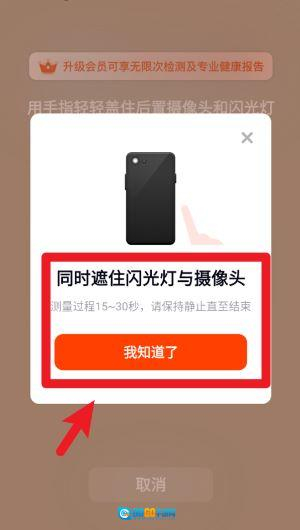 3、按照提示,用手指同时遮住摄像头与闪光灯,以保证系统能够正常采集心率信息。