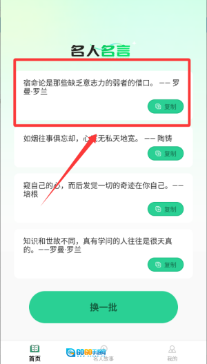 2、进入首页后,你会看到一些名人名言,要是有喜欢的,直接点击就能复制。