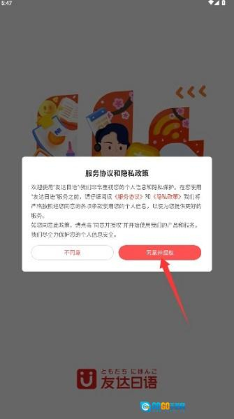 1、打开应用后仔细阅读服务协议和隐私政策,确认后点击同意并授权按钮进入。