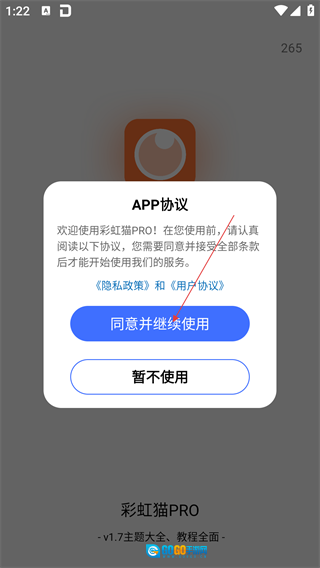 1、启动“彩虹猫PRO”应用,在弹出的协议界面点击【同意并继续使用】按钮,以确认接受《隐私政策》与《用户协议》。