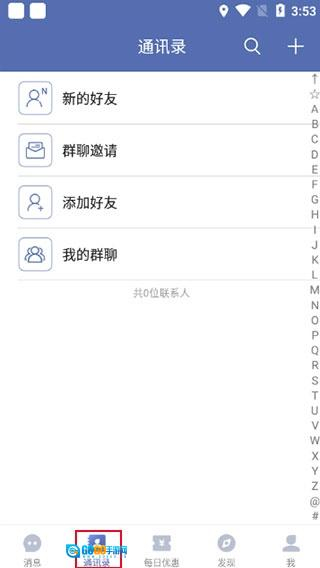 1、在爬爬资源城信后打开,点击“通讯录”可以添加好友,加入群聊。