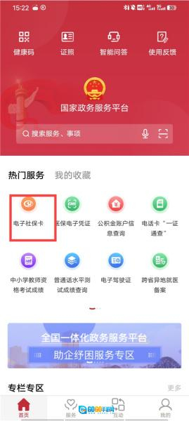 1、进入首页,在热门服务栏目找到“电子社保卡”。