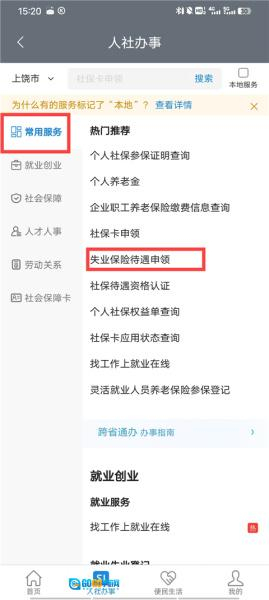 2、在人社办事的常用服务板块中,找到并选择“失业保险待遇申领”这一选项。
