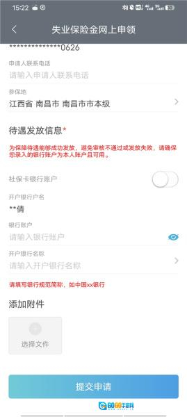 5、进入后,依次输入申请人联系电话、银行卡账户,接着选择上传附件,最后点击提交申请就可以了。