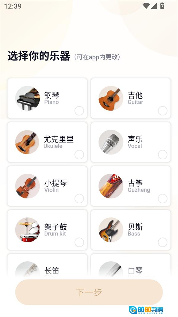 2、完成账号登录后,我们可以从几十种不同类型的乐器中进行选择,然后挑战自己感兴趣的那些。