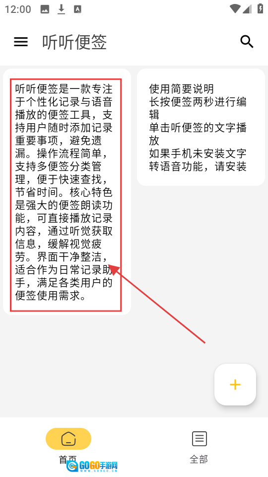 1、在听听便签的首页就能看到使用说明,要是想创建新的便签,只需点击右下角的【+】按钮,就可以着手记录内容了。