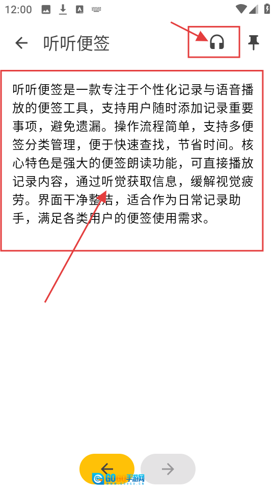 2、进入新建的便签页面,输入内容后,点击右上角的耳机图标,就可以听到便签内容的朗读,非常方便。