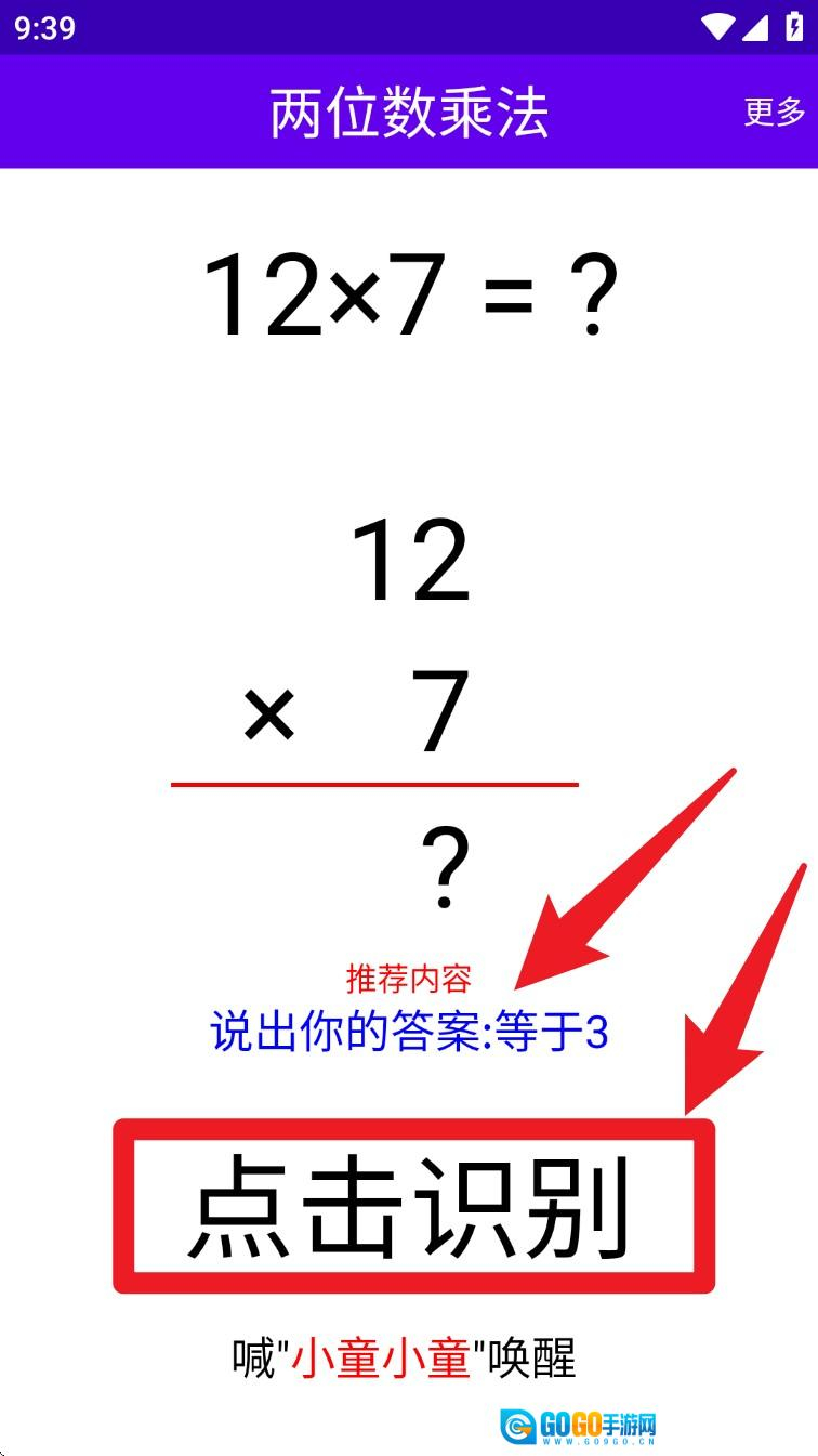 2. 页面中央会呈现题目,用户既可以直接说出答案,也能够点击下方的点击识别按钮来进行语音识别。