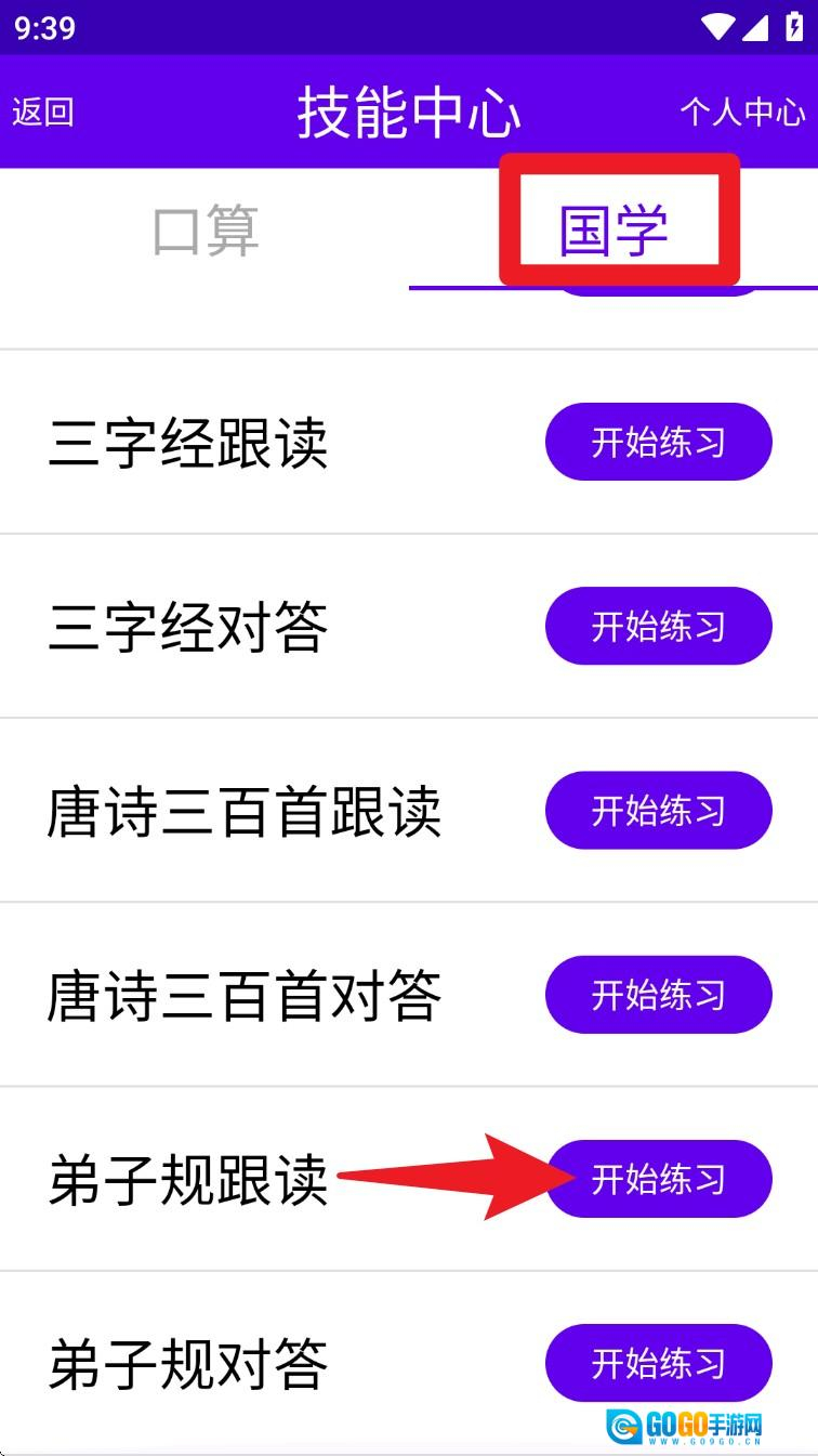 3. 若需切换内容类别,点击顶部的国学标签页,就能进入古诗词与经典朗读模块进行练习。