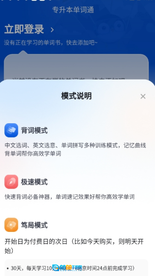 2、词库功能区配有模式说明,用户可根据自身需求选择最适合的学习方式。