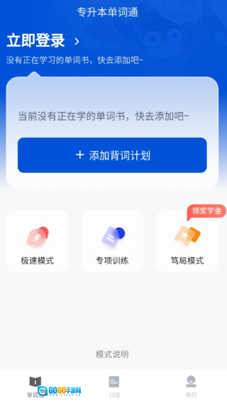 1、进入主页就能添加背词计划,可依据自身需求选择设置极速模式或是专项训练模式;