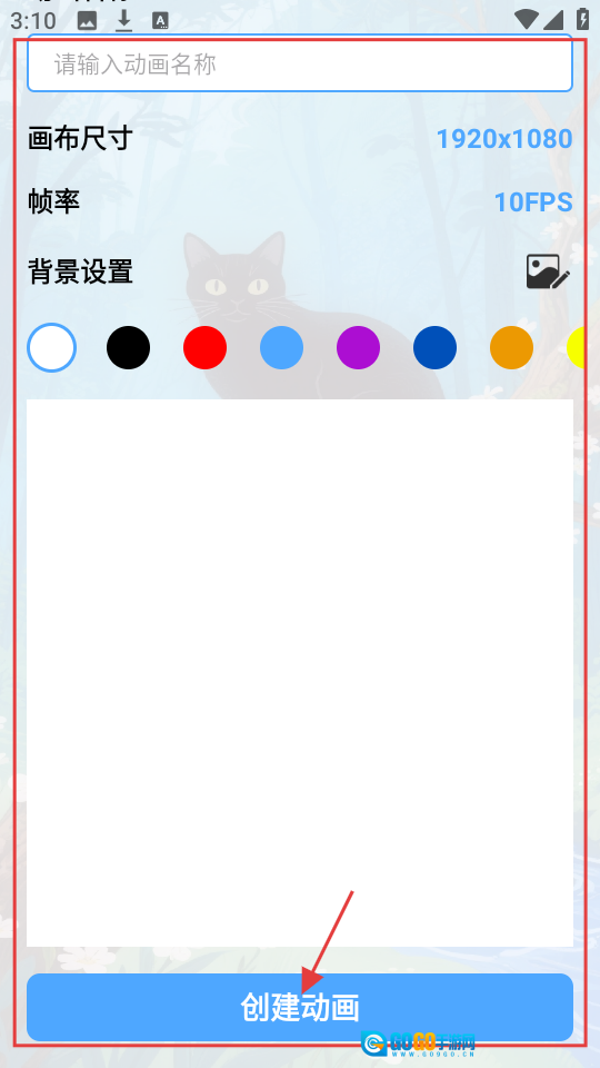 2、动画制作设置页,输入动画名称,选画布尺寸、帧率、背景色,点【创建动画】开始制作。