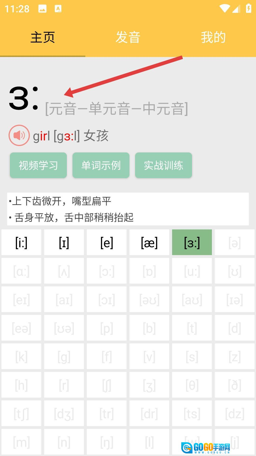 3、音标学习板块会对发音口型等技巧展开详细讲解,像发[ɜː]这个音的时候,上下齿要微微张开,嘴型保持扁平,舌中部略微抬起,以此帮助大家精准掌握发音要点。