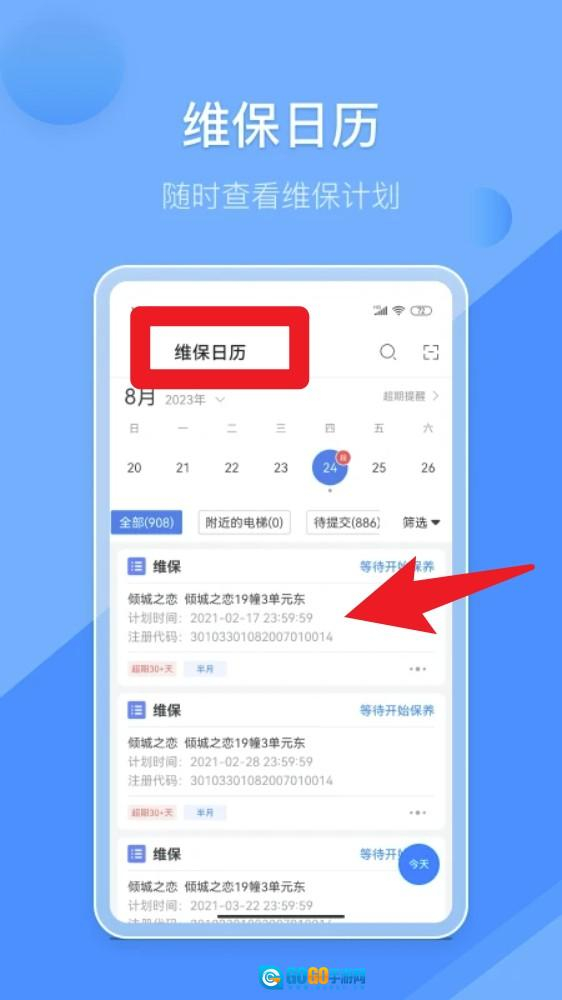 2、维保日历:可查看对应电梯的维保日历,以便清晰了解历史维保记录和计划安排。