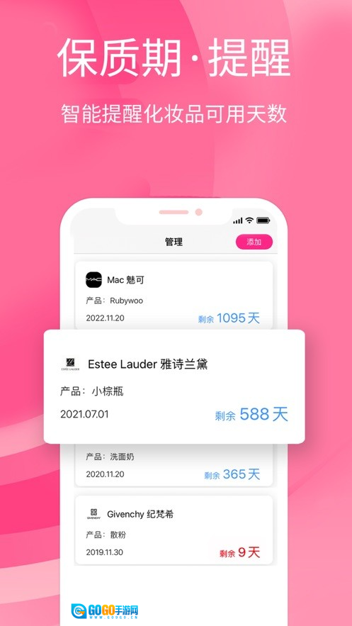 2、智能提醒:化妆品临近保质期时会自动发出预警,助力用户避免每一款产品的浪费;