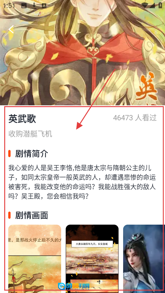 3、进入《英武歌》详情页,可看剧情简介,了解故事背景,还能欣赏剧情画面,感受作品的画面风格。