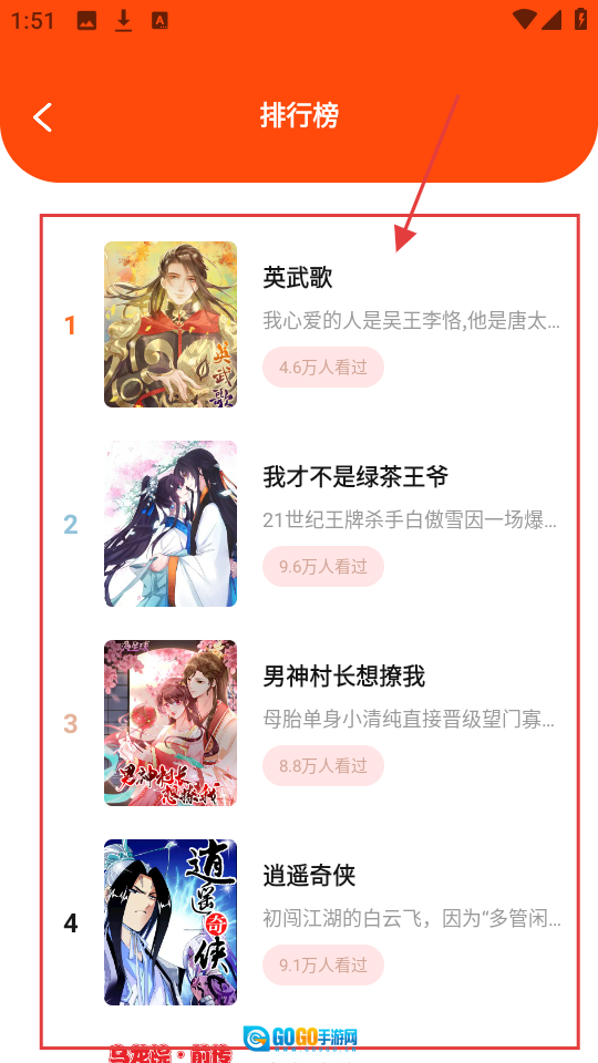 2、进入排行榜页,能看到《英武歌》《我才不是绿茶王爷》等热门作品,选感兴趣的作品点击进入查看详情。