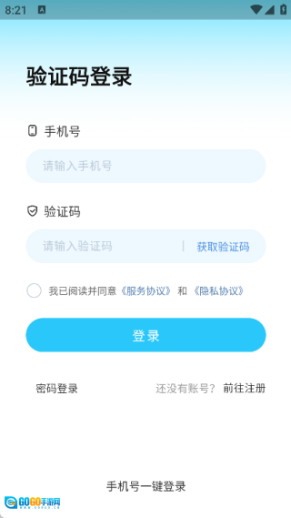 1、启动软件,进入登录界面后,输入手机号与手机短信验证码完成登录;若为首次使用,点击注册按钮,注册成功后即可登录。