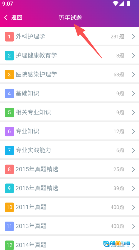 1、支持历年试题的查看,能够浏览外科护理学等多个科目的试题分类情况以及相应的试题数量。