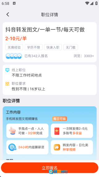 2、查看岗位详情能够了解具体的要求,若符合要求可点击立即报名;