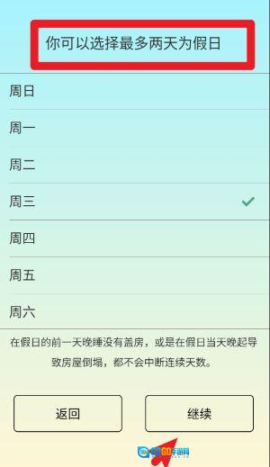 3、然后勾选每周最多两天作为你的休息日,这样一来,即便休息日没能按时睡觉或者起床,也不会对建房进度造成影响。